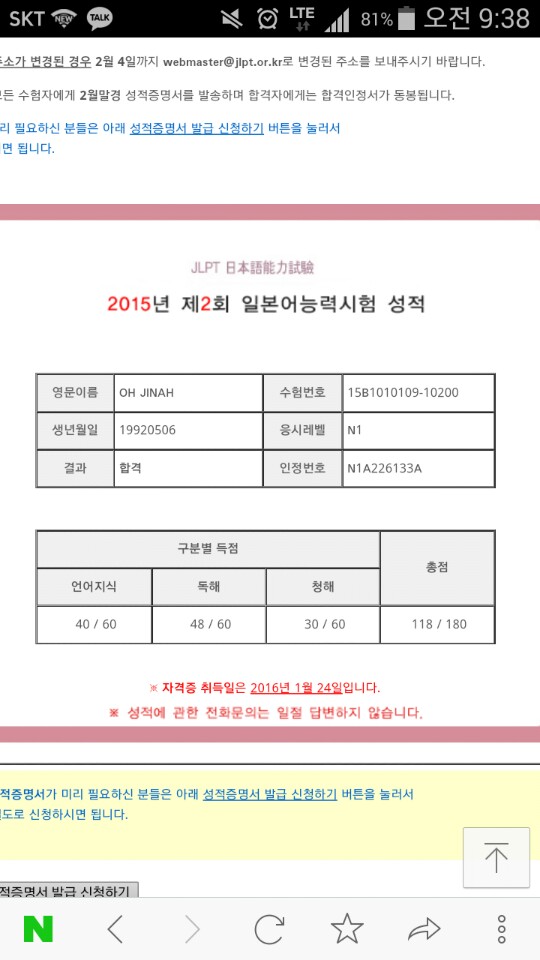 2015년 7월에 N2를 취득하고 이제 9월부터 N1 공부를 시작했습니다. 2015년 초에 일본어 공부를 시작한 터라 N1 취득은 너무 아득하게만 느껴졌습니다. 9월에는 시사일본어 학원이 아닌 종로의 다른 학원을 다녔었는데 수업 구성도 너무 안 좋고 강사분도 너무 불성실하셔서 정말 한 달만에 학원을 관두고 시사 일본어 학원에 10월부터 등록하게 되었습니다. 처음 만나뵈었던 이효세 센세는 정말 온화하신 얼굴로 저를 맞아주셨습니다. 제가 다른 학원에서 한달이라는 시간을 낭비했다고 말씀드렸을때 걱정하지 말라고 센세가 꼭 합격시켜주겠다며 열심히 하자고 하셨습니다. 이전 학원의 강사분과는 다르게 시간이 지나도 하나라도 더 가르쳐주시려는 센세 덕분에 더욱 열심히 하게 되었습니다. 10월은 어휘 수업만 듣다가 수업이 너무 좋아서 11월에는 독해까지 종합반을 들었습니다. 어휘는 센세의 핵심 노트 내용을 꾸준히 암기하는 것이 정말 큰 효과를 봤습니다. 종합반으로 하니 확실히 많은 어휘들을 챙겨갈 수 있었습니다. 듣기도 모의고사 풀이를 통해 수업 진행을 하셨습니다. 정말 센세가 하라는 대로 문법 정리 노트 만드니 처음에 거의 다 틀렸던 문법 성적이 서서히 오르기 시작했습니다. 시간 분배도 철저히 훈련시켜 주셨습니다. 또 센세는 매일 주요 단어들을 카톡으로 보내주시기 때문에 일본어에 노출될 수 있는 기회가 많았던 것 같습니다. 카톡뿐만 아니라 네이버 밴드에도 좋은 학습 자료들을 시험 직전까지 올려주셔서 정말 도움이 많이 되었습니다. 센세가 찍어주시는 문제들이 정말 많이 나왔는데 특히 문법과 같은 경우는 센세가 내신 게 아닐까 싶을 정도로 배운 그대로 출제 되었습니다. 듣기 점수는 조금 아쉽지만 처음 치는 일본어 시험에 단번에 합격할 수 있었던 것은 바로 이효세 센세와 함께여서 였던 것 같습니다. 선생님 너무 감사드립니다!!!! :):):)