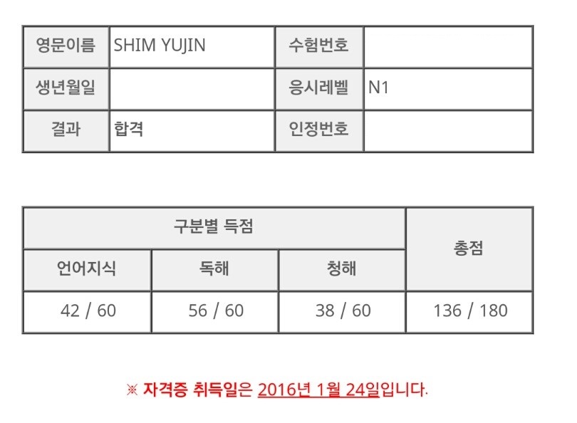 1급 시험 두달전인 10월달에 이효세 선생님의 언어지식 수업을 처음 듣게되었어요. 선생님이 수업 첫째날에 프린트를 나눠주시며 문제를 한번 풀어보라 하셨는데, 1급 문제는 단어도, 문법도 정말 아는게 하나도 없어서 처음부터 끝까지 다 찍었던게 기억나네요. 저는 이번 시험은 그냥 N1 간만 보고, 당연히 2016년 1회차 시험까지 볼 생각을 하고 있었어요. 근데 이렇게 붙게 되다니.. 지금도 믿기지 않아요ㅜㅜ 좀더 일찍 선생님의 수업을 들었더라면 고득점을 노려볼 수 있었을것같아요. 그게 아쉽지만!ㅜㅜ 정말 선생님덕분에 N1 시작한지 두달만에 합격할수 있었습니다.. 너무너무 감사합니다 이효세선생님!