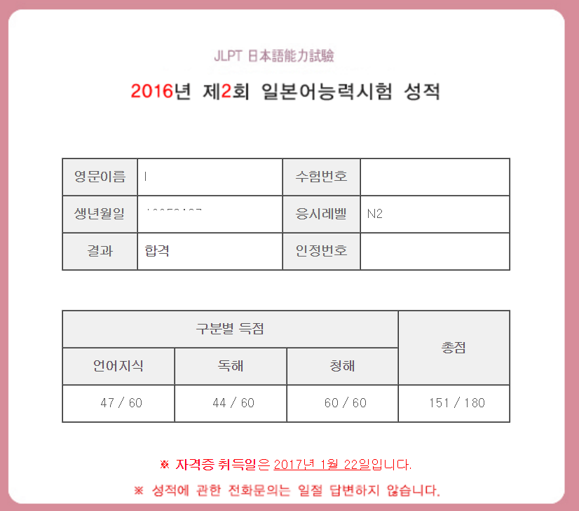 처음에 들어갔을 때는 JLPT 2급을 빠른시간안에 따야하는 조금 힘든 조건을 가지고 있어서 조금 걱정했었습니다. 하지만 3개월,2개월 등등 들어온 기간에 맞춰서 정확히 합격을 위한 필요조건을 제시해 주시는 선생님 덕에 불안감 없이 차근차근 시험준비를 해나갈 수 있었던 것이 가장 큰 도움이 되었다고 생각합니다. 또 처음에는 합격 커트라인인 90점 주변을 생각했었지만, 결과를 보니 예상 외의 고득점이 나왔는데요. 아마 마지막 쪽집게 특강이 점수를 한번에 올리는데 결정적인 역할을 하지 않았나 싶습니다.