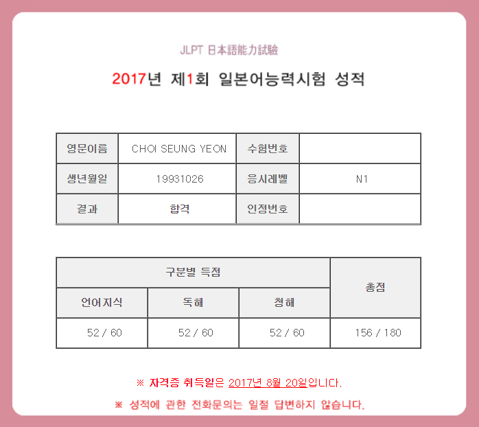 안녕하세요. 2월부터 6월까지 수강했던 학생입니다. 이번 JLPT N1 무난히 합격했습니다. 문형에 너무 약해서 학원을 다닌 것이 좋은 결과로 이어진 것 같습니다. 수업을 통해 약했던 문형에 익숙해질 수 있었고, 예문을 읽다보니 더욱 오래 기억에 남았습니다. 그리고 수많은 문제를 풀면서 문제 유형에 익숙해질 수 있었고, 유사단어 하나하나의 의미도 자세히 배울 수 있습니다. 특히, 언지 파트4 문제가 수업에서 봤던 단어들이 많이 나와 시험장에서 순식간에 풀 수 있었습니다. 독해수업도 天声人語 같은 좋은 문장들을 중심으로 진행되어서 독해실력 향상에 큰 도움이 되었습니다.