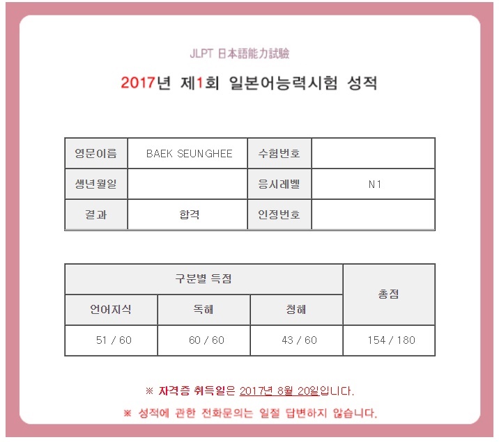 작년 12월에 n2를 따고 이번에 학교를 다니면서 3월,4월은 월수금 언어지식반을 들었는데 학교일이 더 바빠지면서 5월,6월은 토요 종합반을 다녔어요 송상훈 선생님께서 재미있게 꼼꼼하게 잘 가르쳐주셔서 합격할 수 있었던 거 같아요 한자에 너무 약해서 우선은 언어지식반을 다녔던 건데 교재에 나오는 것 외에도 재밌는 이야기랑 좋은 표현들을 많이 알려주셔서 좋았어요 토요반도 언어지식 독해 청해 골고루 잘 가르쳐주셔서 좋았습니다 제가 학원 외에 개인적으로는 공부를 많이 하지 못했는데.. 이런 저한테 기적같은 점수라고 생각합니다ㅋㅋㅋ n1 합격 송상훈쌤 덕분이에요 ㅎㅎㅎ감사합니당